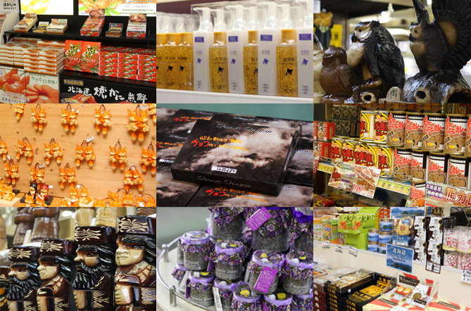 1階は広さ300坪の売店で、北海道の郷土品から民芸品、北の味覚や定番のお菓子など、種類も豊富にご用意しております。